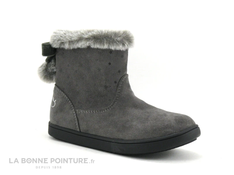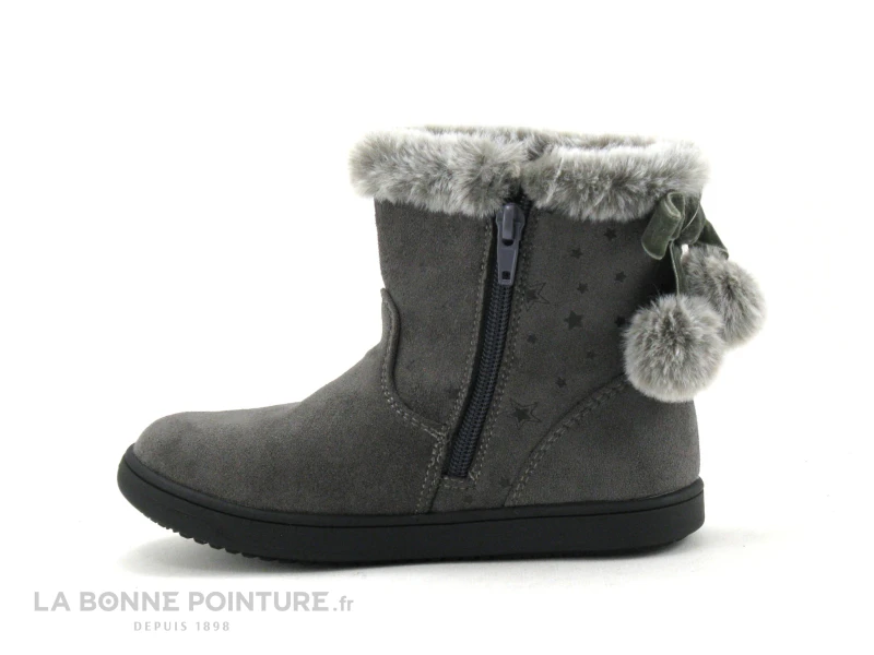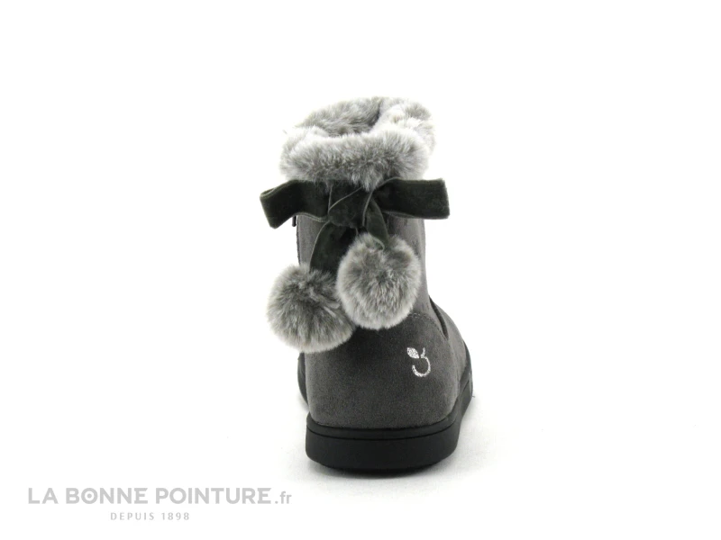 3 Pommes ALIB Gris – Bottine Fille Grise – Col Fourrure Et Pompons