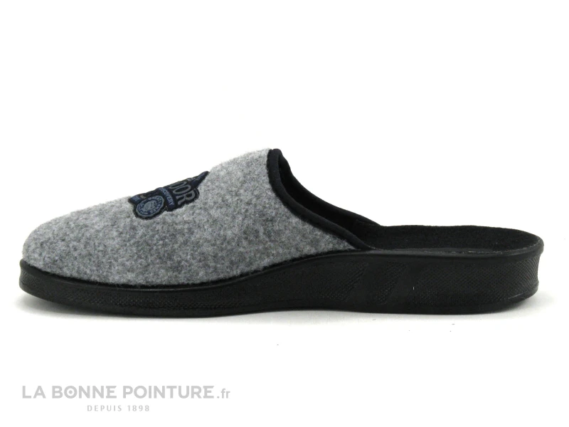 Cette pantoufle mule Homme fabriquée en France est en textile molletonné gris, avec un écusson sur le dessus noir et bleu marine.