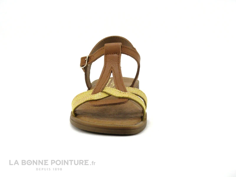 Cette sandale fille Bellamy Tilou combine un cuir marron camel et un cuir jaune aspect lézard aux reflets brillants.
