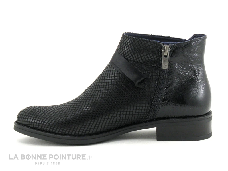 Ces belles boots Femme noires Dorking combinent un cuir verni et un cuir aspect python noir et aussi verni.